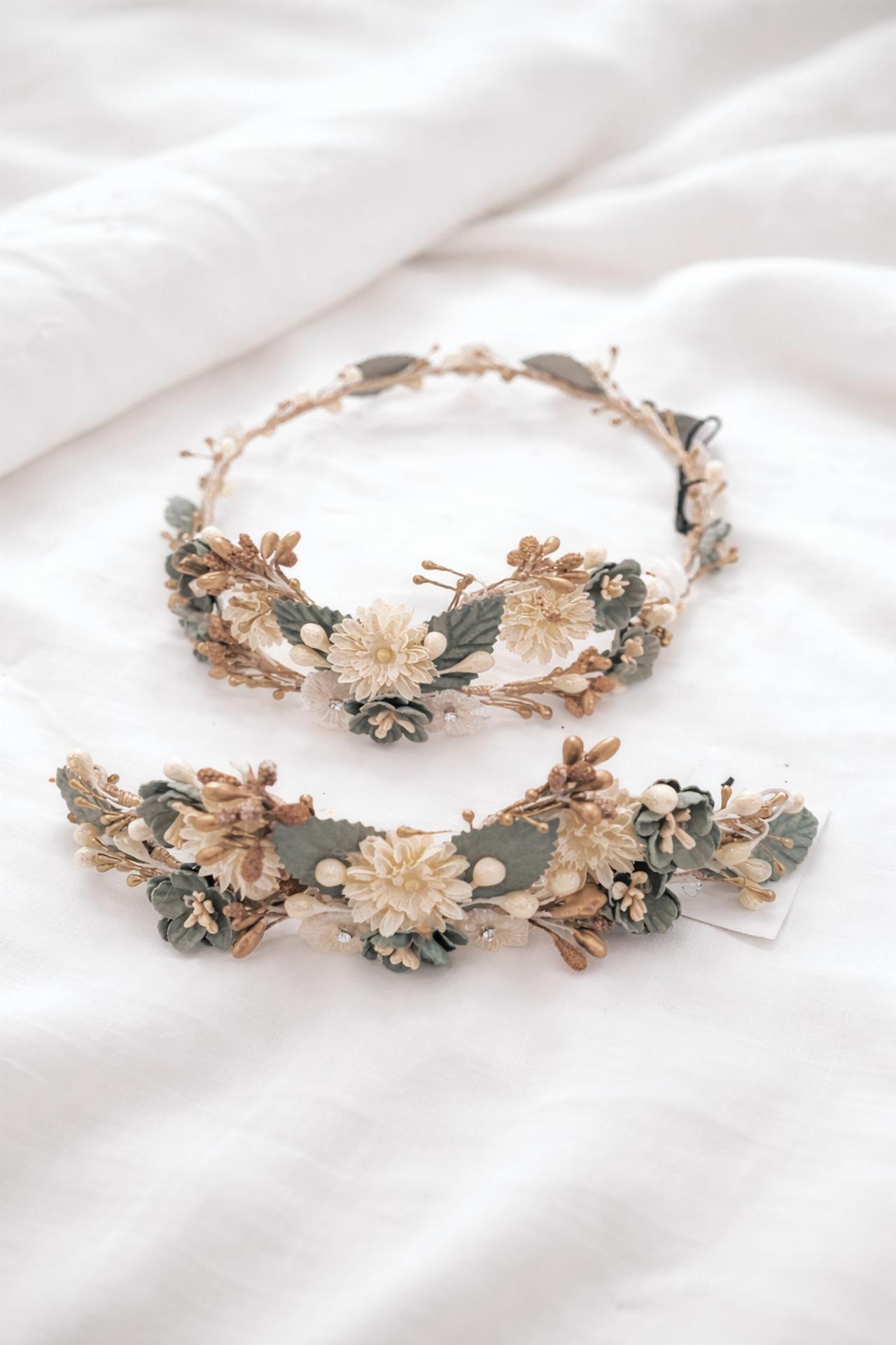 Conjunto corona y tocado verde agua, verde salvia comunión niña.