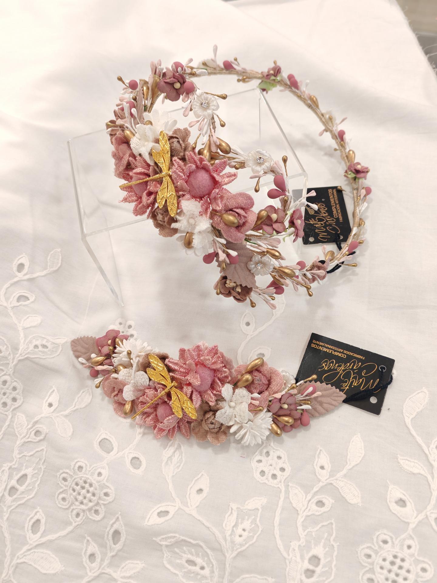 Tocado y corona de comunión a juego. Modelo Helena rosa.