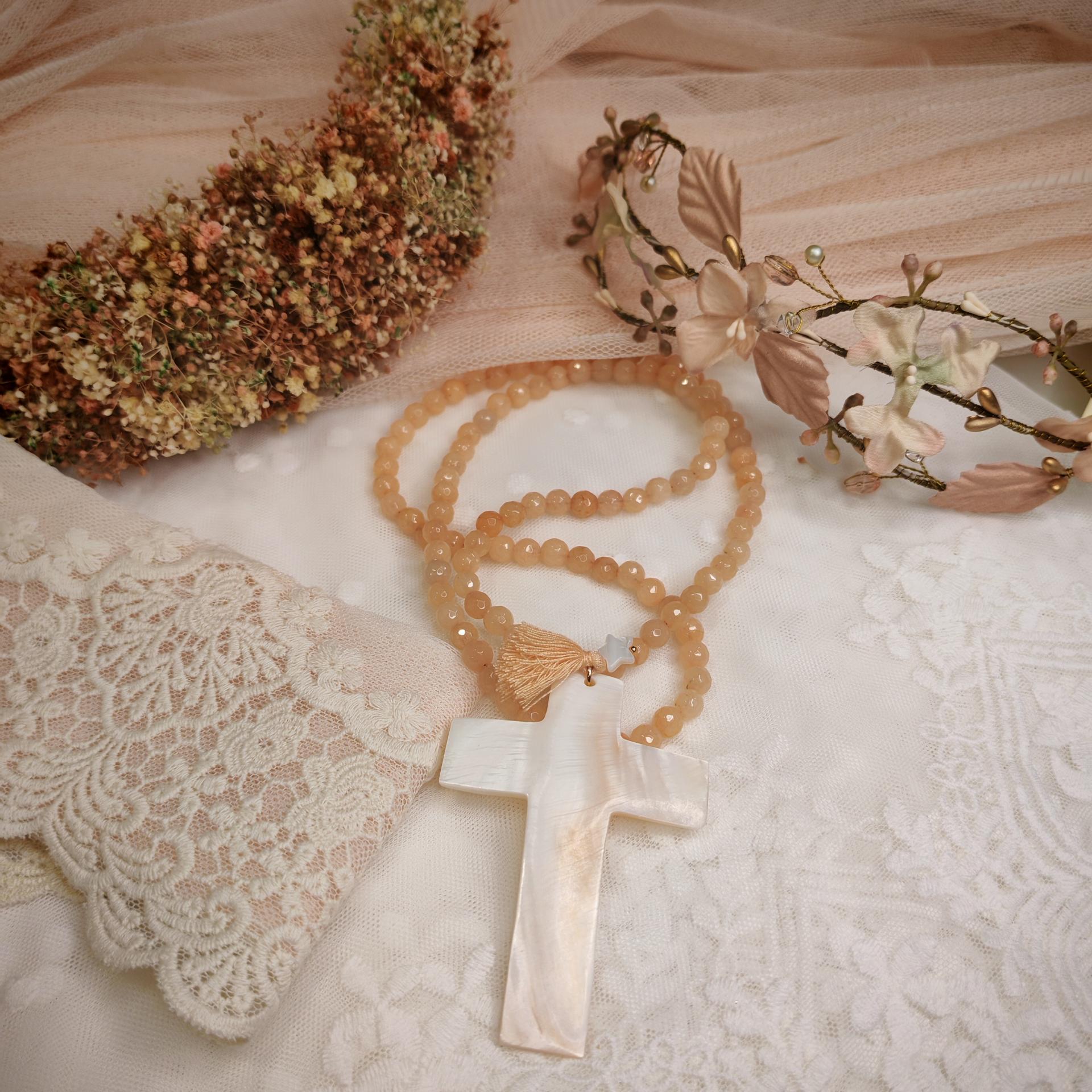 Cruz de comunión niña color melocoton con cruz de nacar.