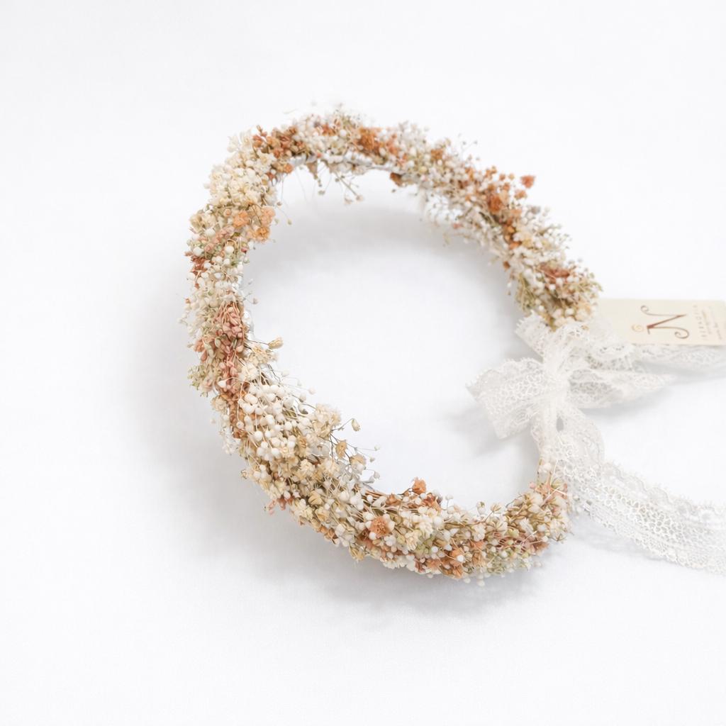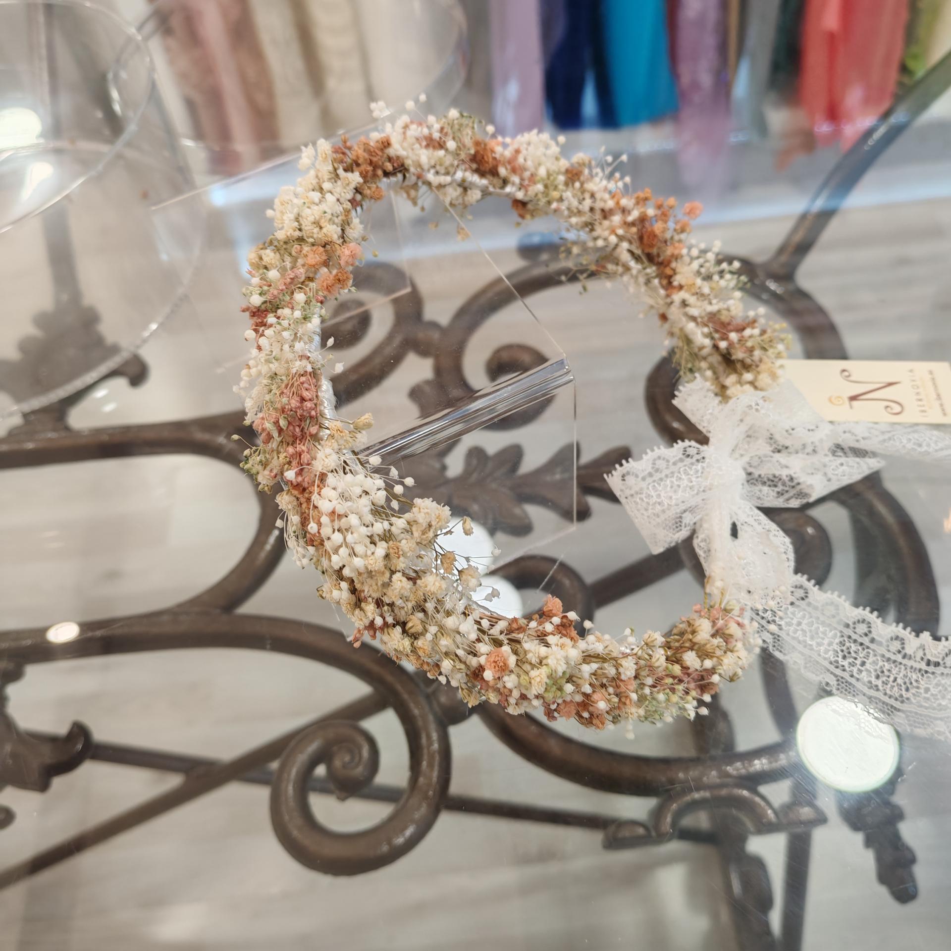 Corona de flores preservadas. Abierta y con lazo detrás. Producto por encargo
